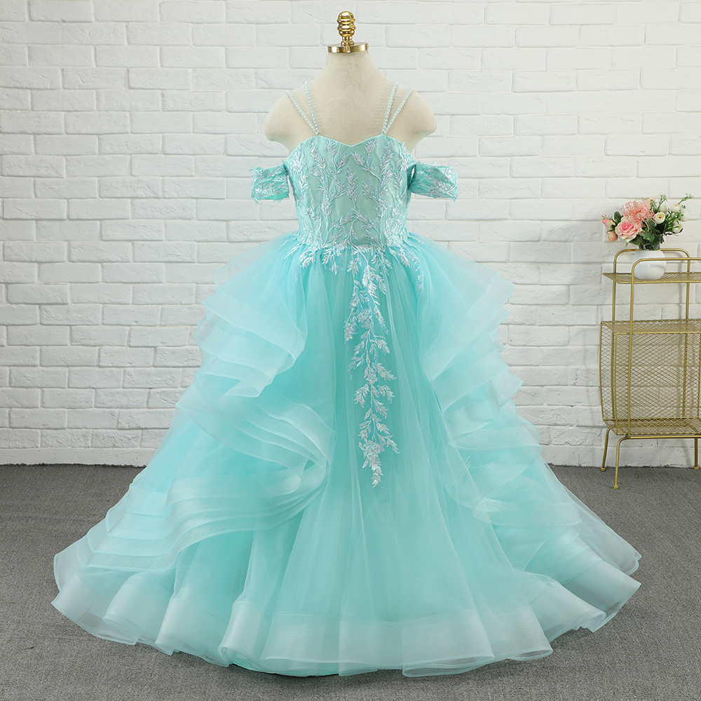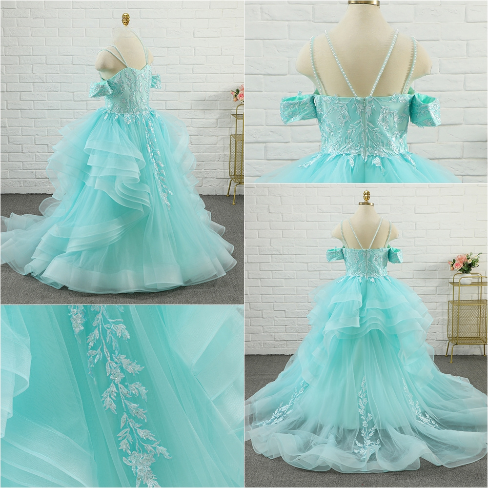 New Blue Puffy Flower Girl Dresses Off The Shoulder Princess Skirt Tulle Puffy First Communion Gowns Cute Kids Clothing Hand Made