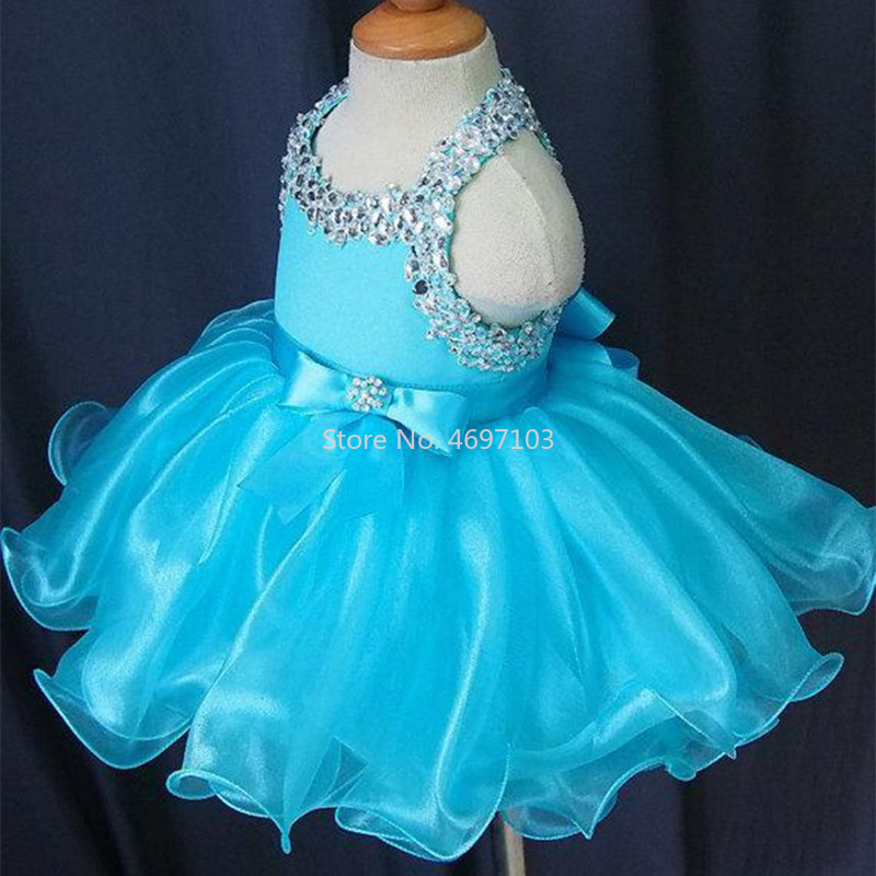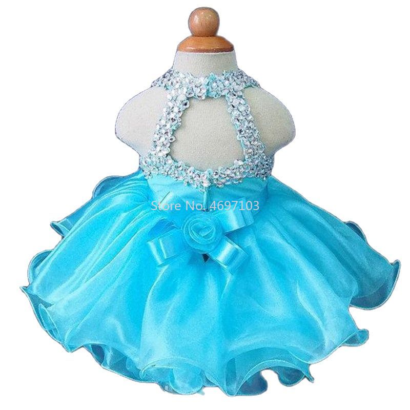 Crystals Halter Sky Blue Flower Girl Dress Wedding Formal Knee Length Princess Skirt Kids Clothes Ruffles Organze Ball Gown