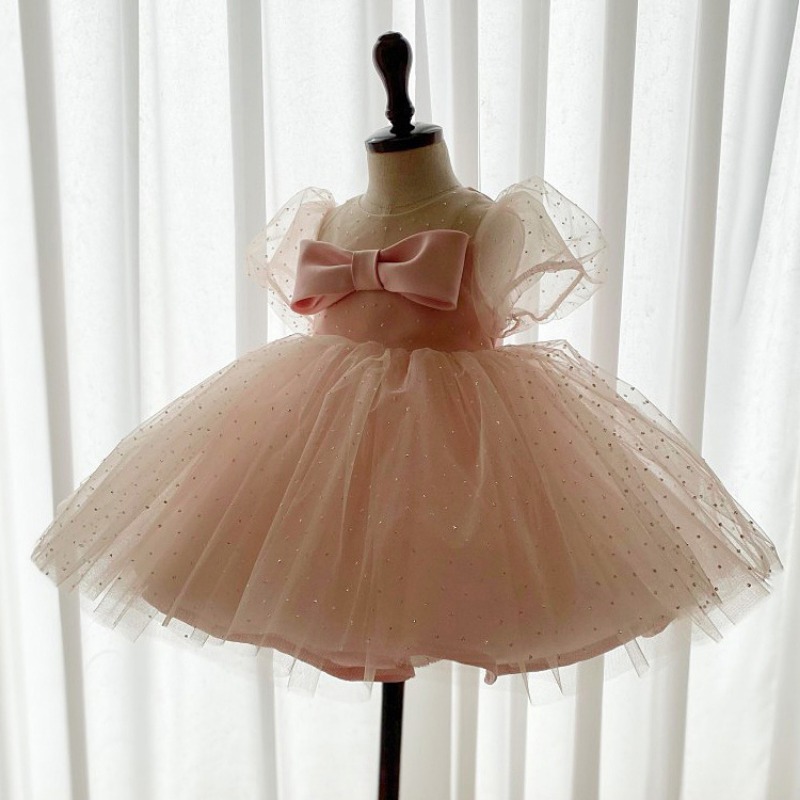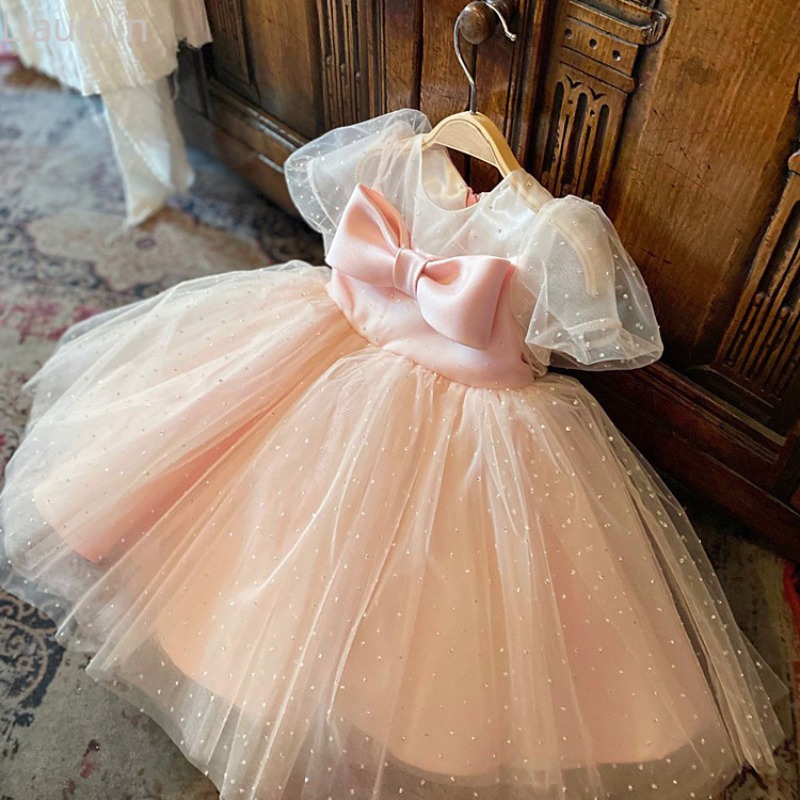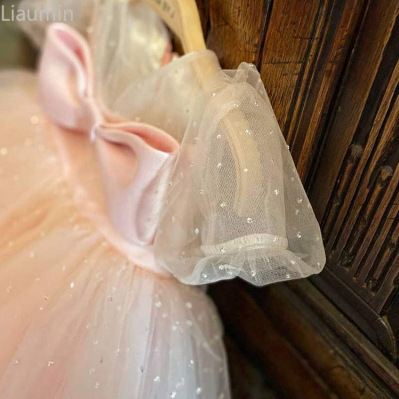 Cute Pink Short Sleeve O-Neck Sequins With Bow Flower Girl Dress Princess Skirt For Wedding Brithday Party Custom Size