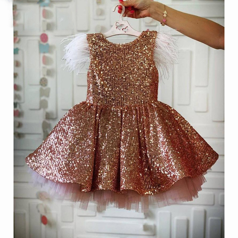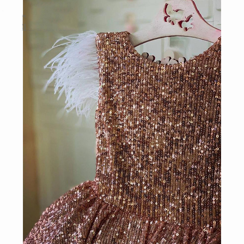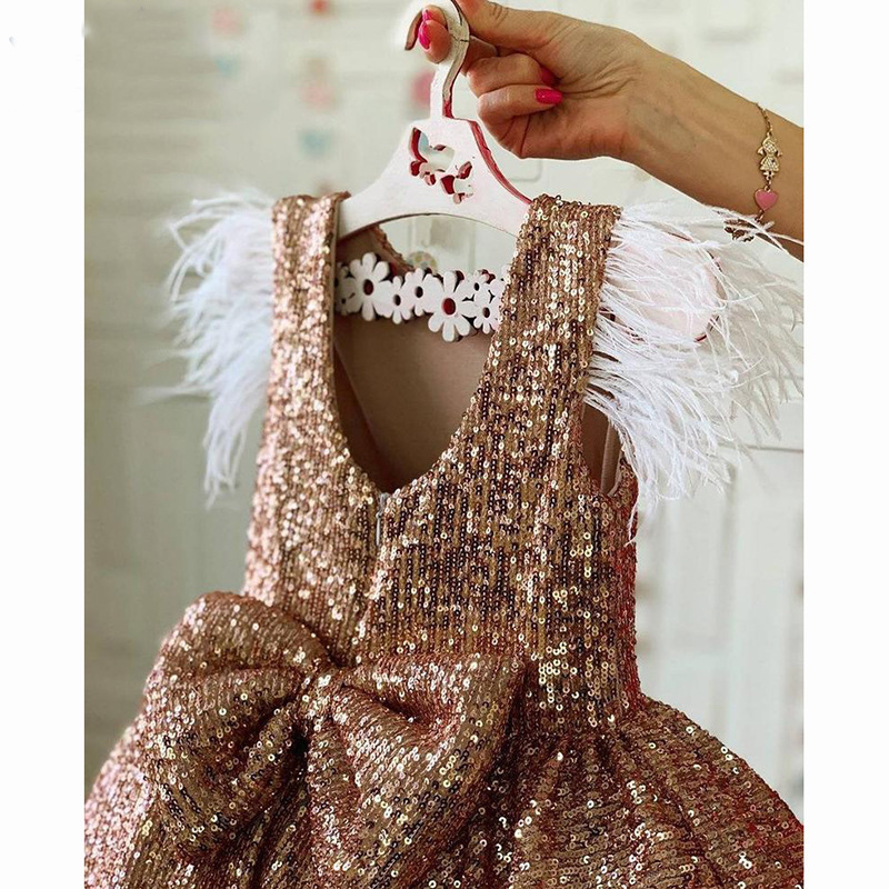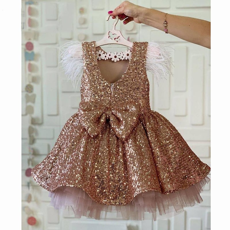 New Luxurious Pink Sequins Flower Girl Dress Princess Short Length With Bow Applique Brithday Party Kids Skirt Hand Made