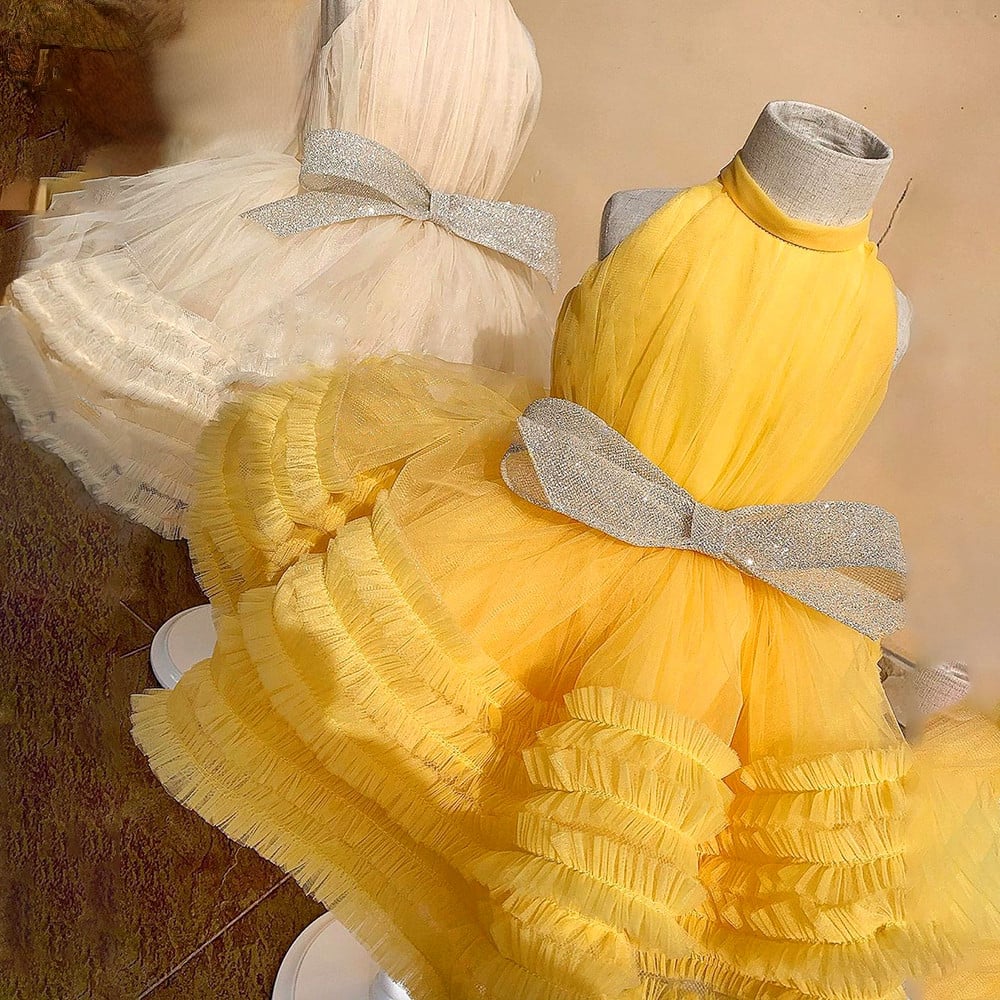 New Hand Made Yellow Baby Bow Puffy For Child High Collar Formal Wedding Communion Knee Length Flower Girl Dresses Kids Clothing