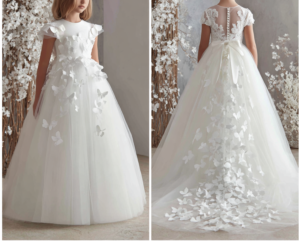 White Full Length With Butterfly Flower Girl Dress Brithday Party Kids Skirt Princess Clothing W1-16