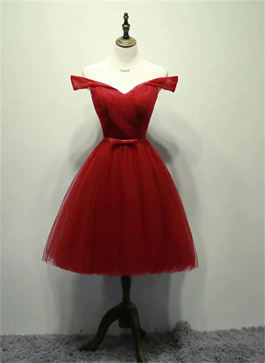 Dark Red Off the Shoulder Tulle Knee Length Party Dress Red Homecoming Dress