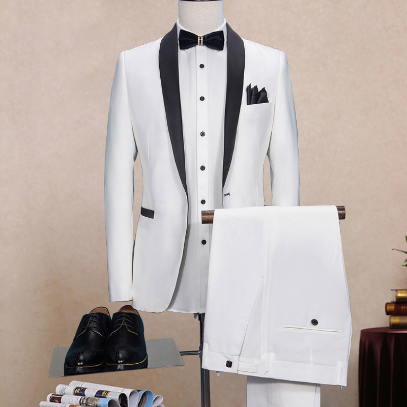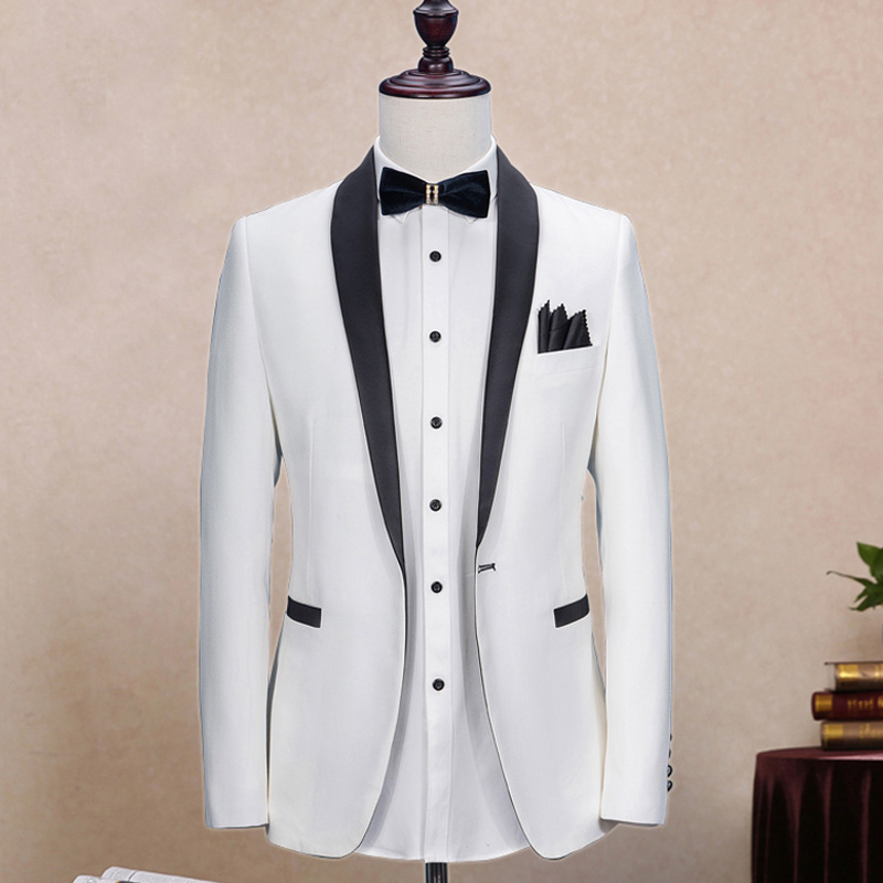 White Wedding Men Suits Black Shawl Lapel Two Piece One Button Single Breasted Wedding Groom Tuxedos (Jacket + Pants)