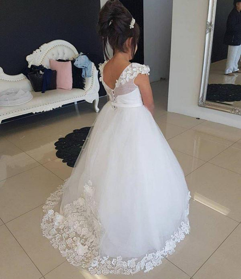 Flower Girl Dresses A Line Jewel Lace 3D Applique Sweep Train Girls Pageant Dresses For Wedding Party Girl Dresses for Wedding