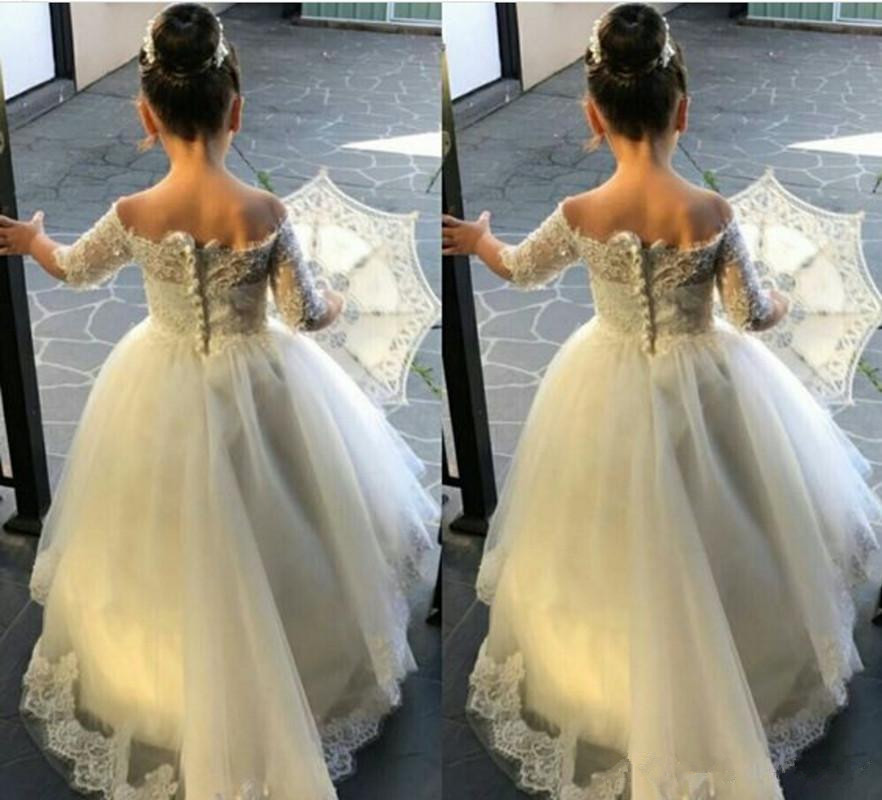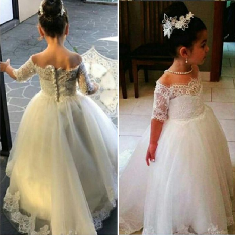 Princess Flower Girls Dresses For Weddings Half Sleeves White Off the Shoulder Girl Dresses Lace Appliques Kids Party Gown