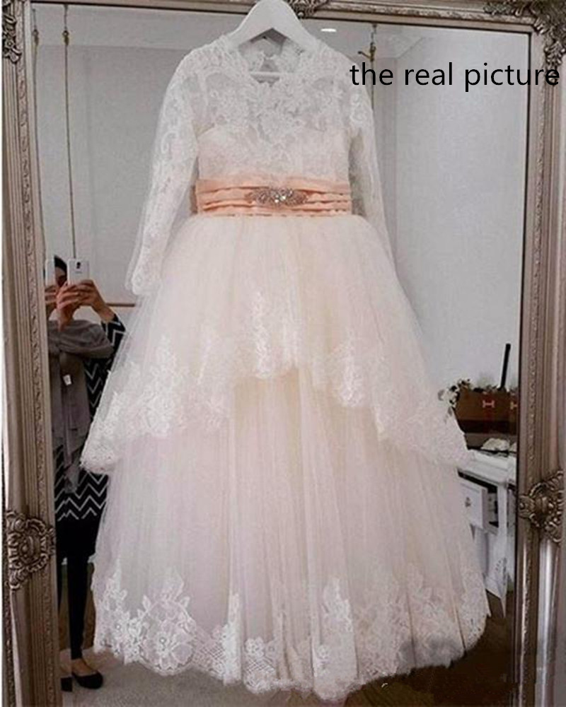 Tiered Flower Girl Dresses A Line Jewel Lace Applique Girls Pageant Dresses With Beaded Sash For Wedding Party