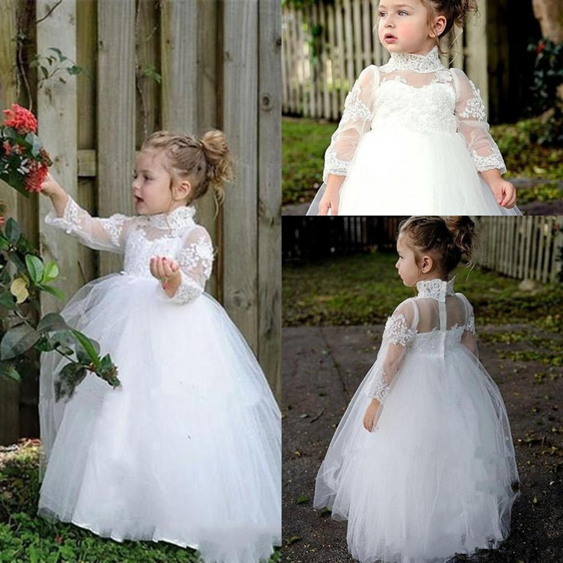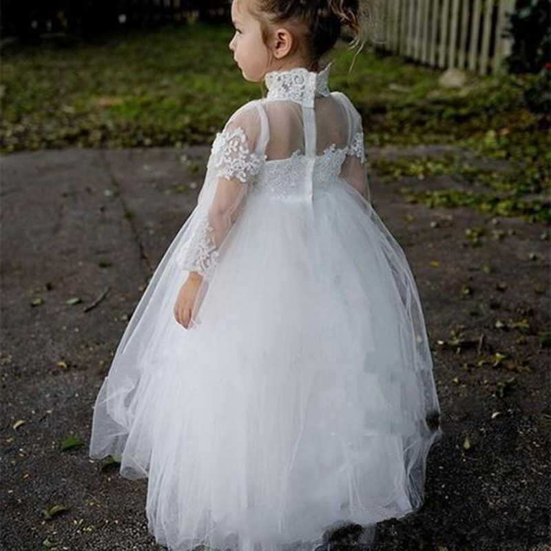 Puffy Princess Flower Girl Dresses White Lace Appliques Sheer Long Sleeve High Collar Ball Gown First Communion Birthday Dress