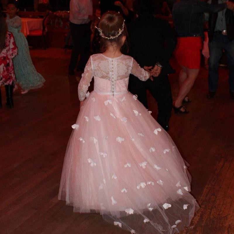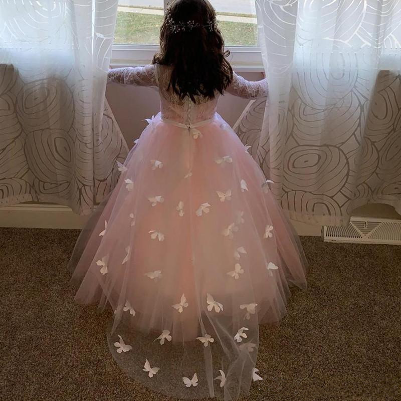 Customzied Flower Girl Dress with Butterflies Belt Full Sleeves Buttons Jewel Neck Holy First Communion Gowns Robe De Fiesta