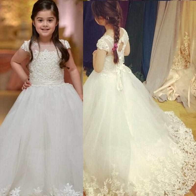 Flower Girl Dresses For Weddings With Capped Sheer Neck Appliques Lace Cupcake Pageant Dress For Girls Long Beads Girls Wedding