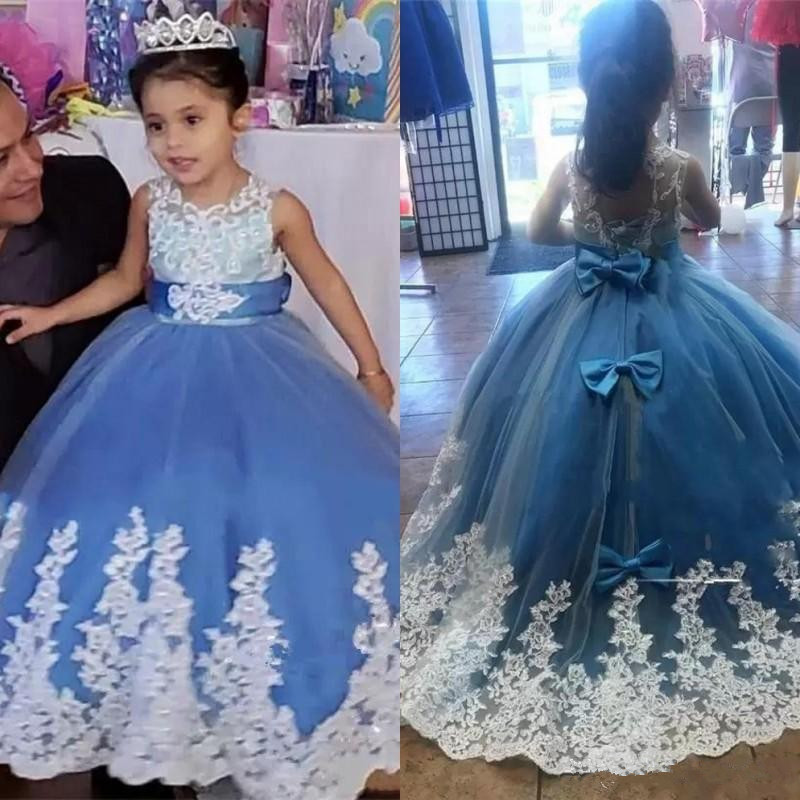 New Adorable Flower Girl Dresses Lace Appliqued Princess Ball Gown Baby Sheer Neck With Bow Back Arabic Girl Pageant Gowns