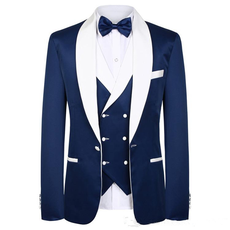 Blue Men Wedding Suits New Real Groomsmen White Shawl Lapel Groom Tuxedos Mens Tuxedo Wedding/Prom Suit 3 Pieces(Coat Pants Vest)