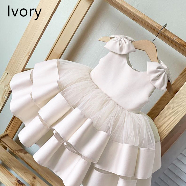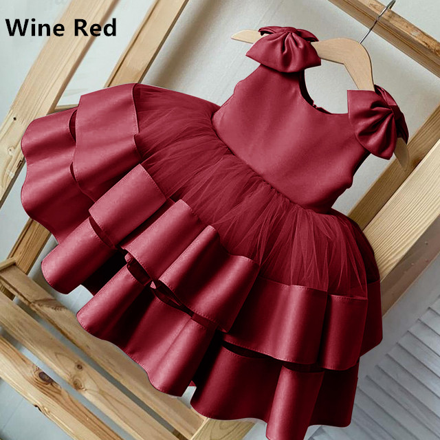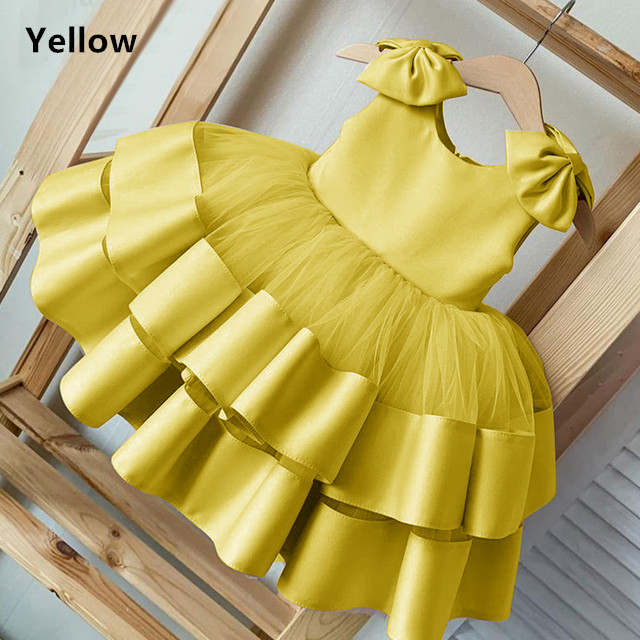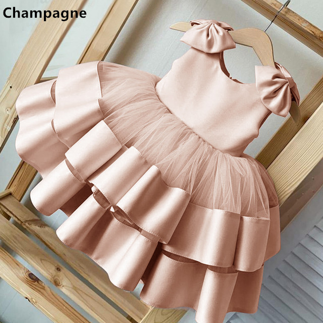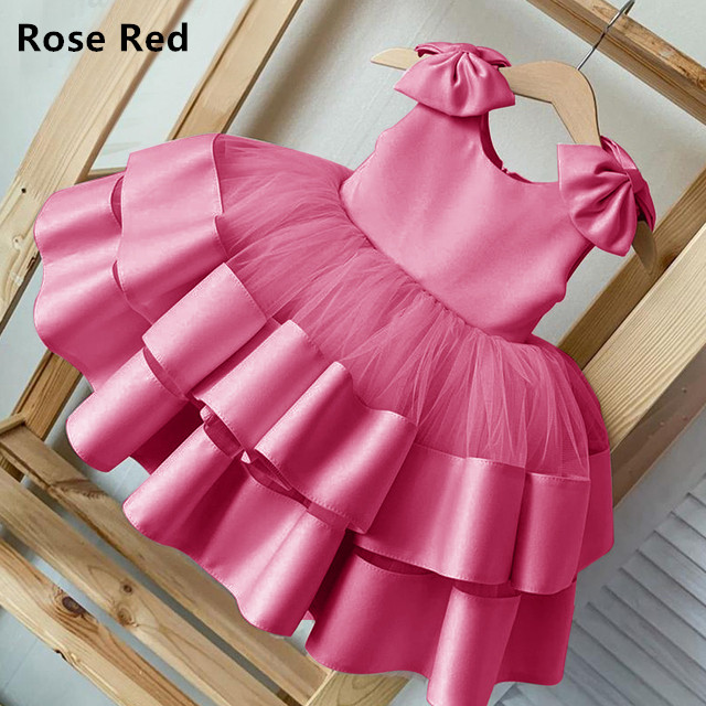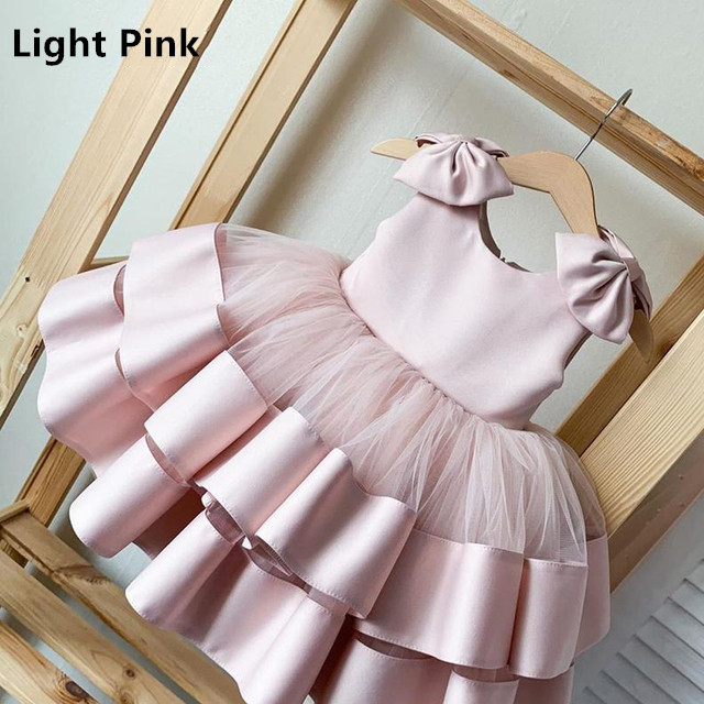 Puffy Layers Pink Flower Girl Dresses Satin Bow Kids Princess Dress Bow Shoulder Kids First Communion Dresses Birthday New Year
