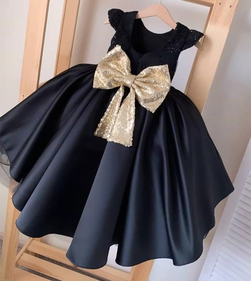 Black Flower Girl Dress for Wedding Kids Pageant Birthday Formal Party Lace Long Dress Bowknot First Birthday Prom Gown