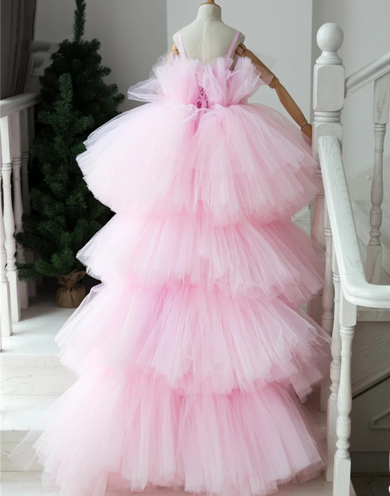 Pink Hi-Lo Puffy Layers Flower Girl Dresses Tulle Kids Princess Dress Bow Shoulder Kids First Communion Dresses Birthday