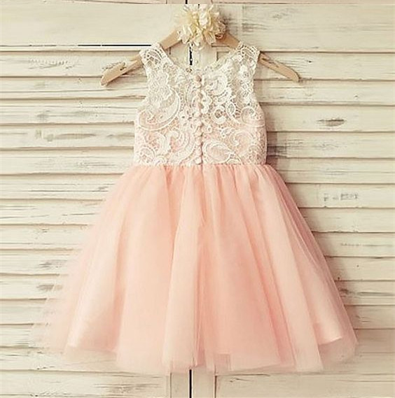 Pink white Lace Applique Flower Girl Dress Kids Party Clothing