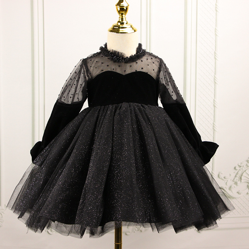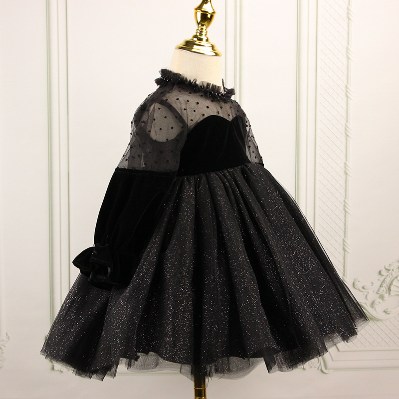 Black Knee Length Flower Girl Dresses For Wedding Long Sleeve Sheer Jewel Party Toddler Pageant Clothes Vestidos De Hand Made