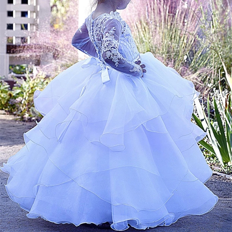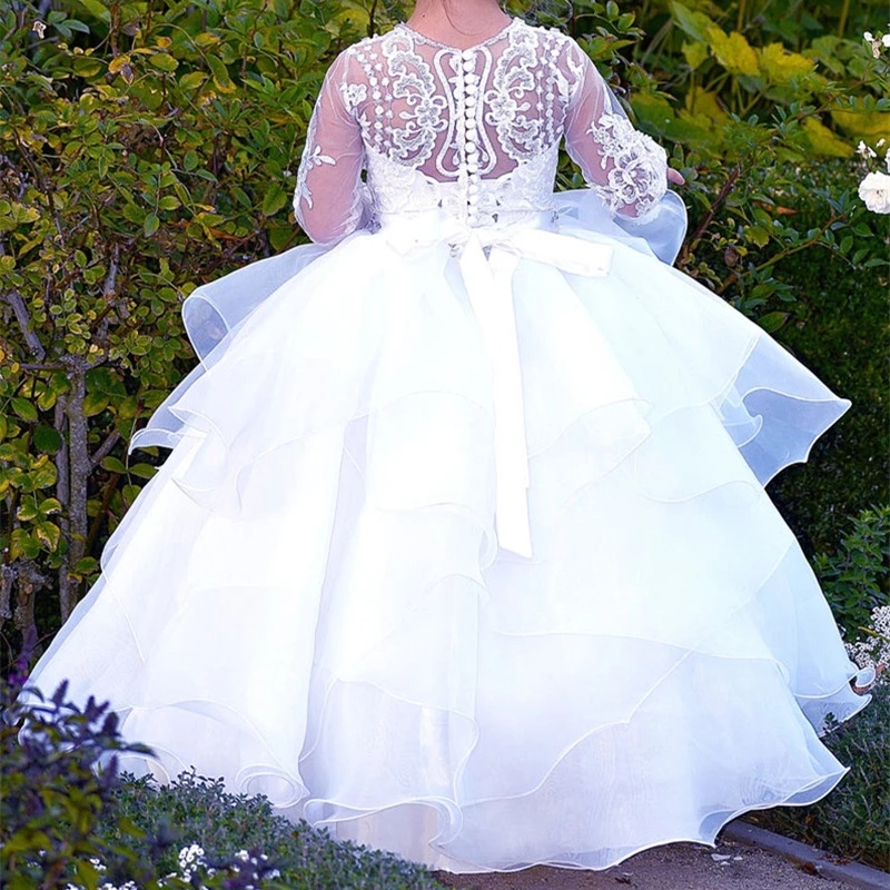 White Ivory Ball Gown Flower Girl Dresses Long Sleeve Princess Skirt Tulle Puffy First Communion Gowns Cute Kids Clothing Hand Made