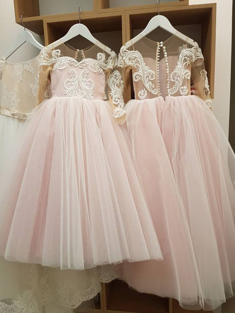 New Pink Flower Girl Dresses Tulle Lace Applique Sheer Neck Cap Sleeves Ball Gown Sweep Train Kids Child Formal Party Gowns