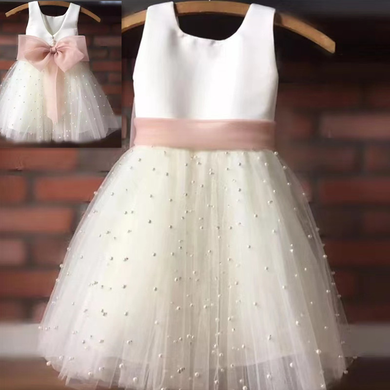 Kids Pearls Tulle Pageant Skirt Flower Girl Dress Chiffon Bow Sashes First Communion Clothing For Little Baby Princess Custom