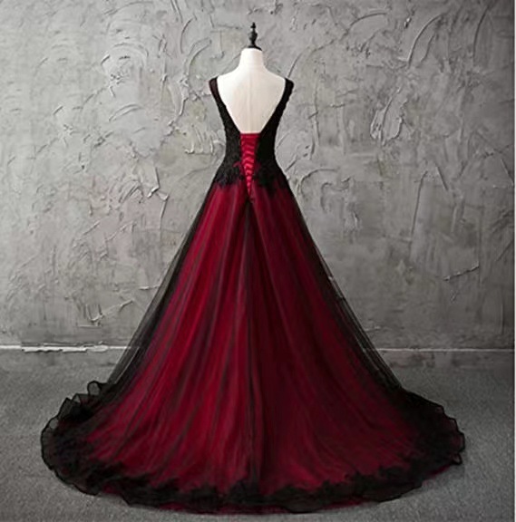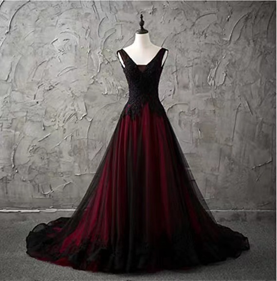 Red And Black V Neck Lace Applique Prom dress Full Length Wedding Dress Hand Made Custom