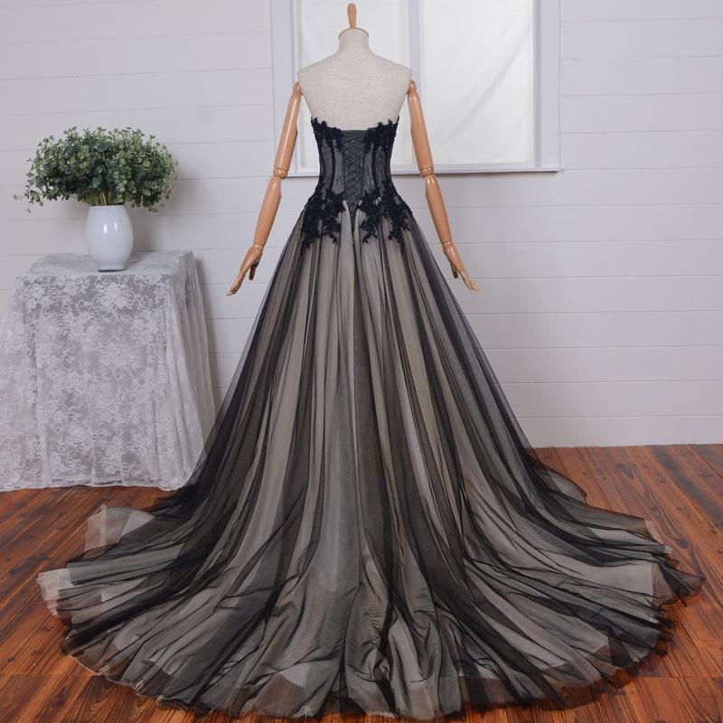 Fashion Strpaless Lace Applique Bridal Gown Black and Champagne Wedding Dress Formal Occasion Custom Plus Size with Train