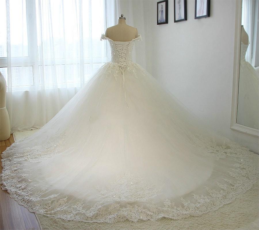 Boat Neck Cap Sleeve Lace Applique Wedding Dress With Long Train Beads Lace Up Back Bridal Gown Pure Hand Made
