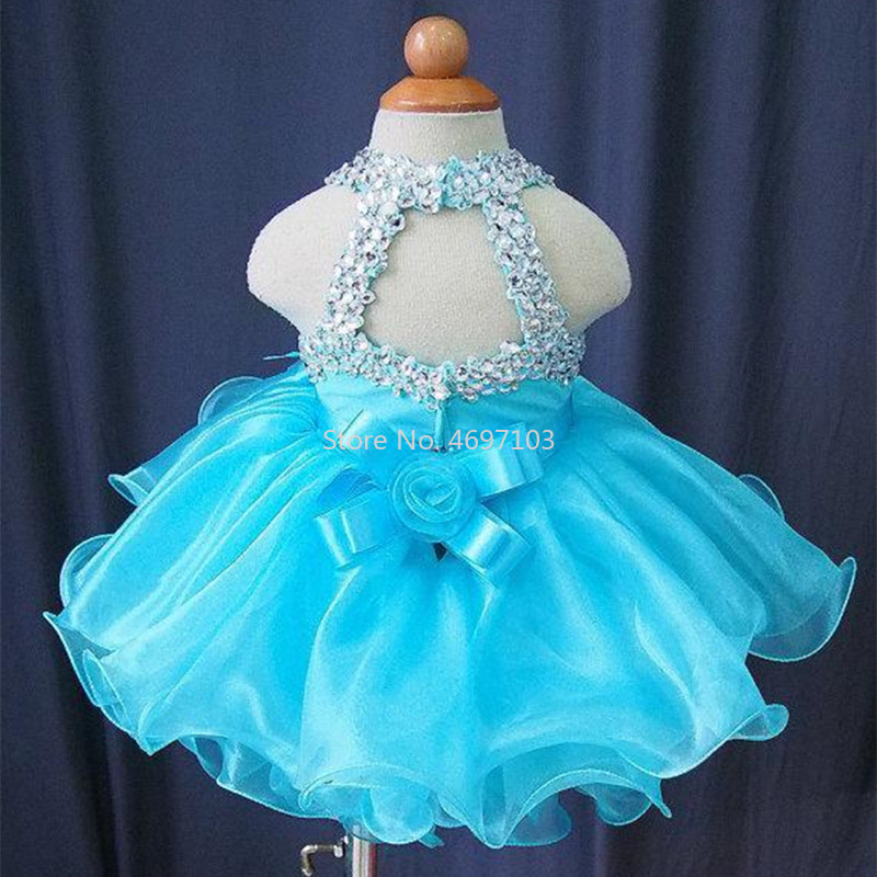 Crystals Halter Sky Blue Flower Girl Dress Wedding Formal Knee Length Princess Skirt Kids Clothes Ruffles Organze Ball Gown