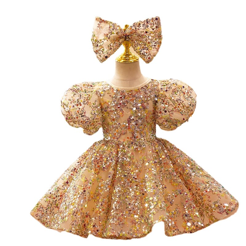 Gorgeous Champagne Gold Ball Gown O-Neck Knee-Length Classic Floral Flower Girl Dresses Princess Puff Sleeves Kids Clothing