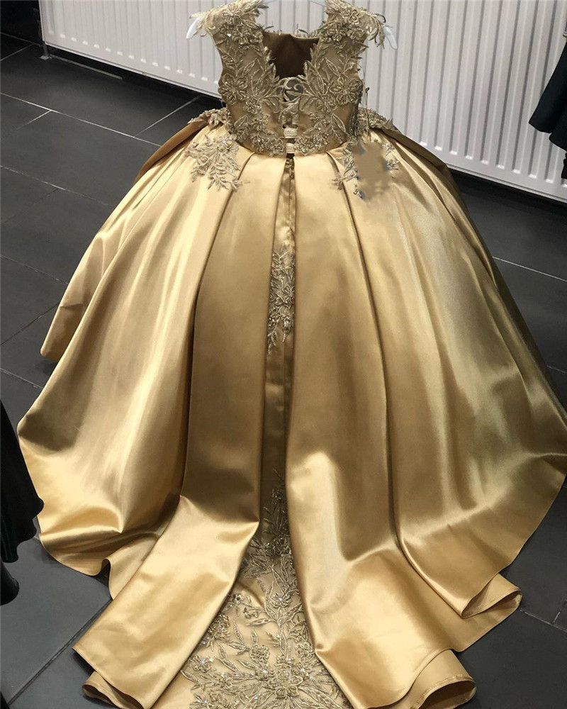 New Hot Beads Gold Flower Girl Dress for Wedding Lace Applique Satin Kids Birthday Party Wear Pageant Gown Hand Made Custom