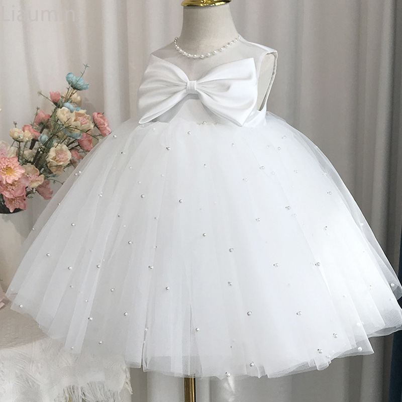Pearl Mesh O-Neck Sleeveless Ball Gown Knee-Length Simple Solid Color Flower Girl Dresses Brithday Party Skirt Hand Made Custom
