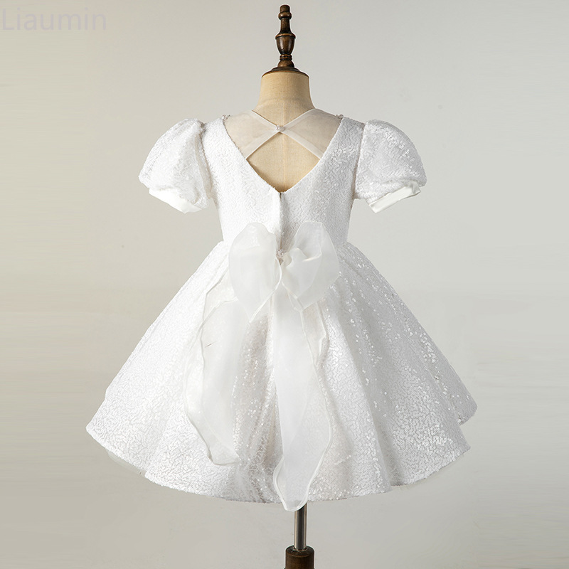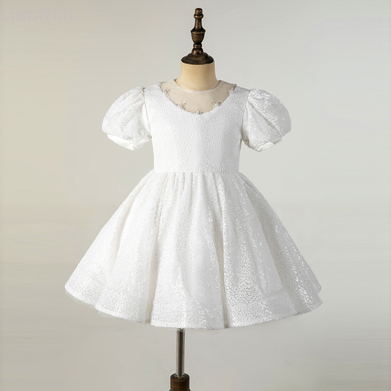 Ball Gown O-Neck Short Sleeve Simple Solid Color Beading Sequins Flower Girl Dress Brithday Party Kids Skirt Princess Cloting